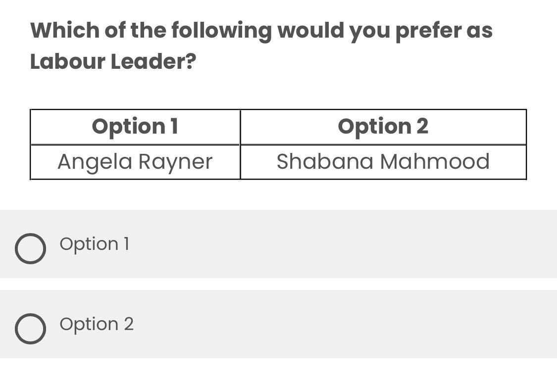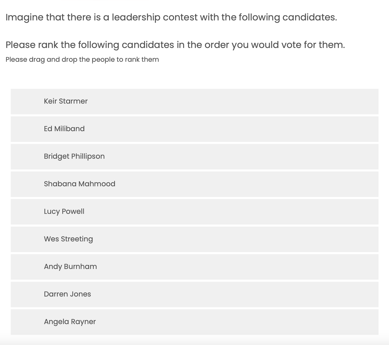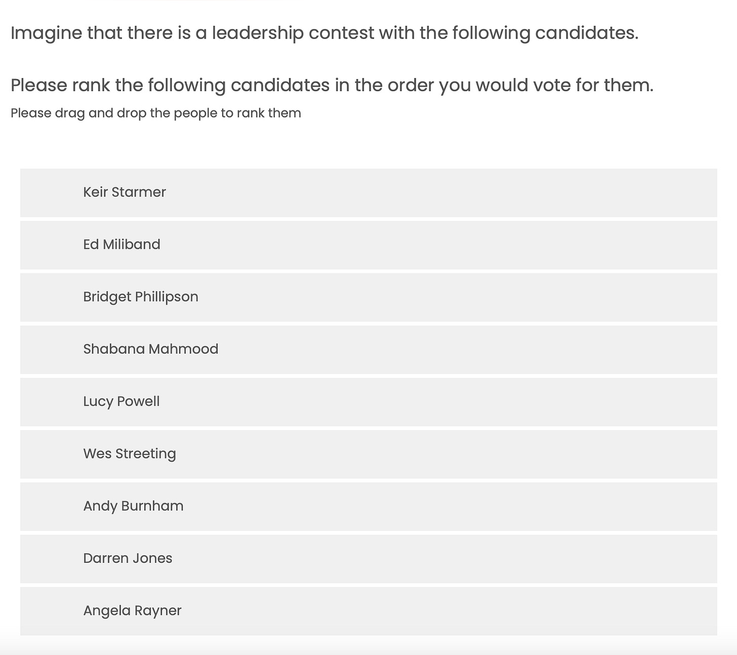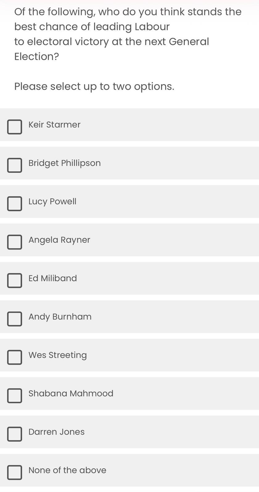 That’s true – I accessed the survey on several devices yesterday and there are lots of questions that aren’t about the leadership. Do you have a degree? Where do you live? Where do you get your news? Did you vote for Lucy Powell or Bridget Phillipson? Should we rejoin the EU? Is the government doing a good job on Gaza, housing, the economy, et cetera? What have you done for Labour lately: knocked on a door, or just shared something on socials? All are helpful things to know if you want to get a feel for the grassroots, though proper polling – rather than a self-selecting questionnaire with cash inducements for completion – would obviously be much more helpful.