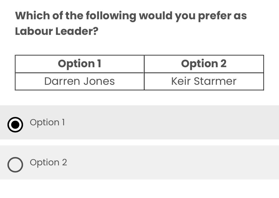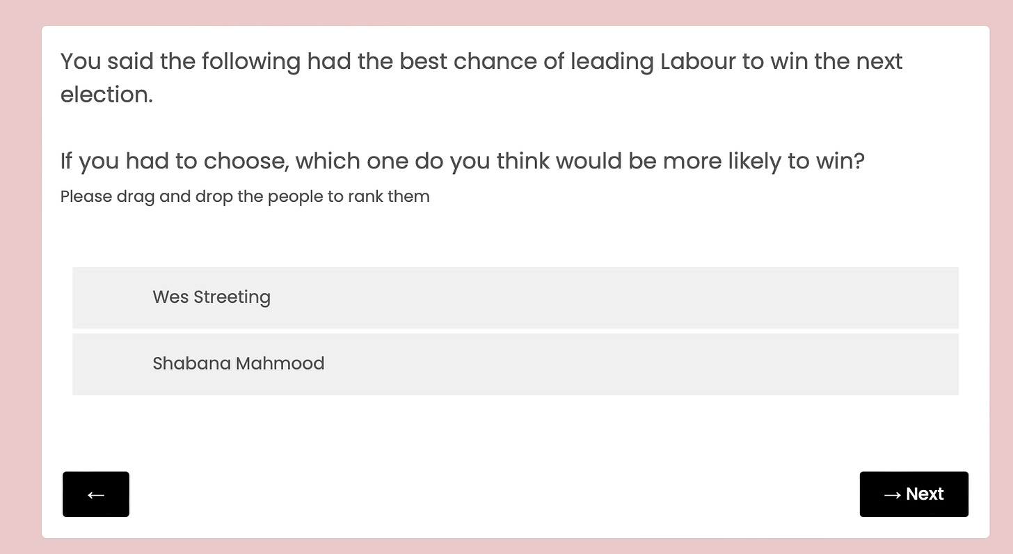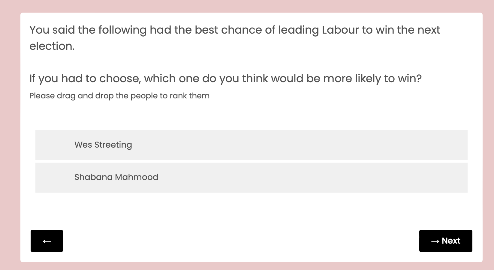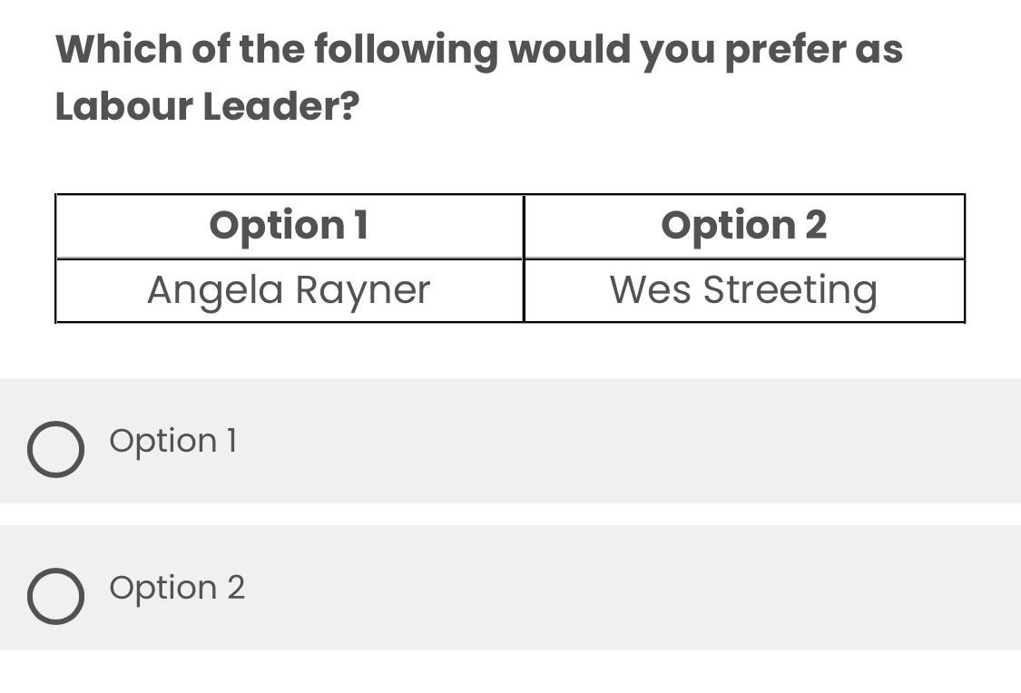 That’s true – I accessed the survey on several devices yesterday and there are lots of questions that aren’t about the leadership. Do you have a degree? Where do you live? Where do you get your news? Did you vote for Lucy Powell or Bridget Phillipson? Should we rejoin the EU? Is the government doing a good job on Gaza, housing, the economy, et cetera? What have you done for Labour lately: knocked on a door, or just shared something on socials? All are helpful things to know if you want to get a feel for the grassroots, though proper polling – rather than a self-selecting questionnaire with cash inducements for completion – would obviously be much more helpful.